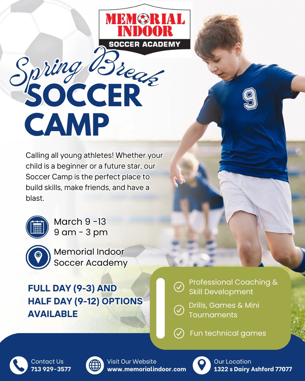 MEMORIAL INDOOR IS NOW ENROLLING FOR OUR ANNUAL SPRING BREAK SOCCER CAMP MAR 10-14 FOR AGES 5-13.
